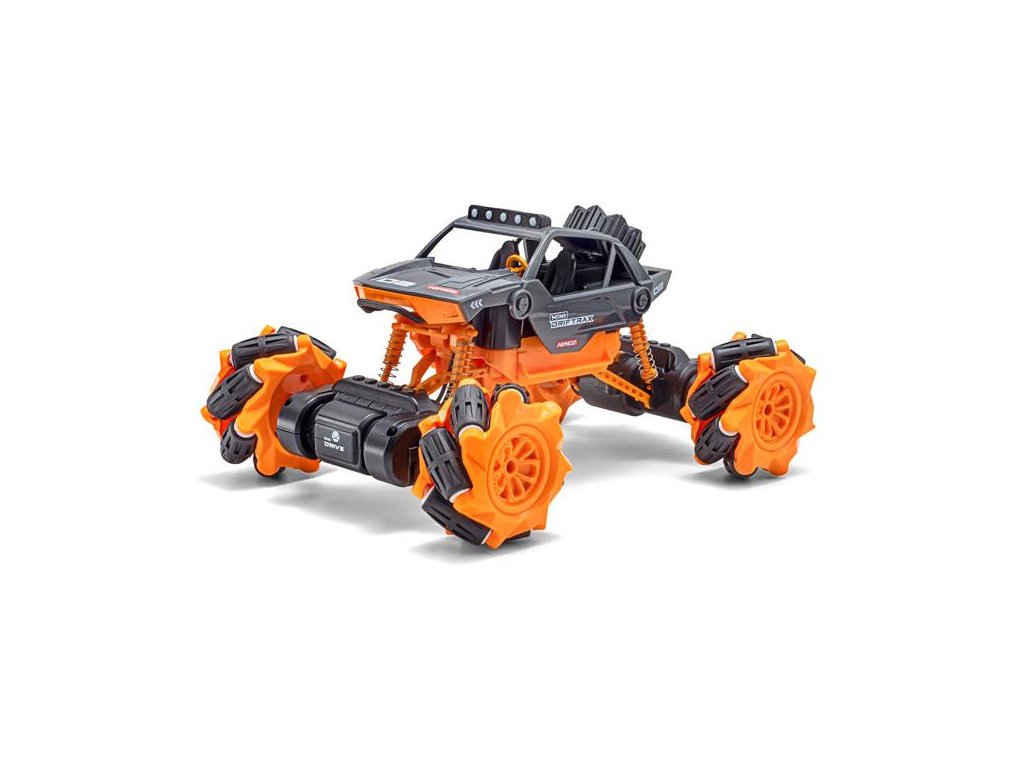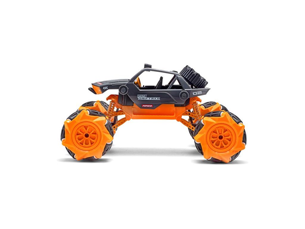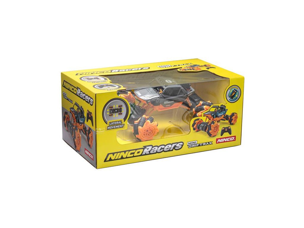 RC hračka pro děti NINCORACERS Mini Driftrax je autíčko na dálkové ovládání, se kterým si díky válečkovým kolům užijete spoustu zábavy. Válečková kola a pohon se čtyřmi motory umožňuje kromě jízdy vpřed a vzad, také jízdu kolmo do stran, pootočení šikmo nebo otáčení kolem své osy na místě. Přední kola nejsou natáčecí, model zatáčí na stejném principu jako například tank. Autíčko má funkční odpružení s pružinovými tlumiči pro přejezd přes nerovnosti. Šasi je v provedení monster truck v dobře rozpoznatelné oranžové barvě. Karoserie je detailně zpracovaná s kokpitem vybaveným sedačkami a volantem.