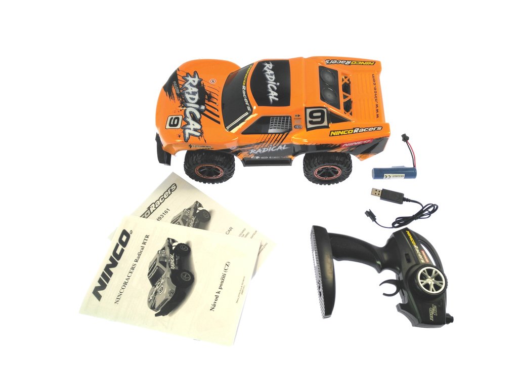 Balení obsahuje auto na dálkové ovládání NINCORACERS Radical, volantový vysílač 2,4 GHz, pohonný Li-Ion akumulátor 3,7 V 1300 mAh, USB nabíječ. Návod CZ a manuál EN, ES, PT, DE, FR, IT, DK, NO, FI, SV, NE.