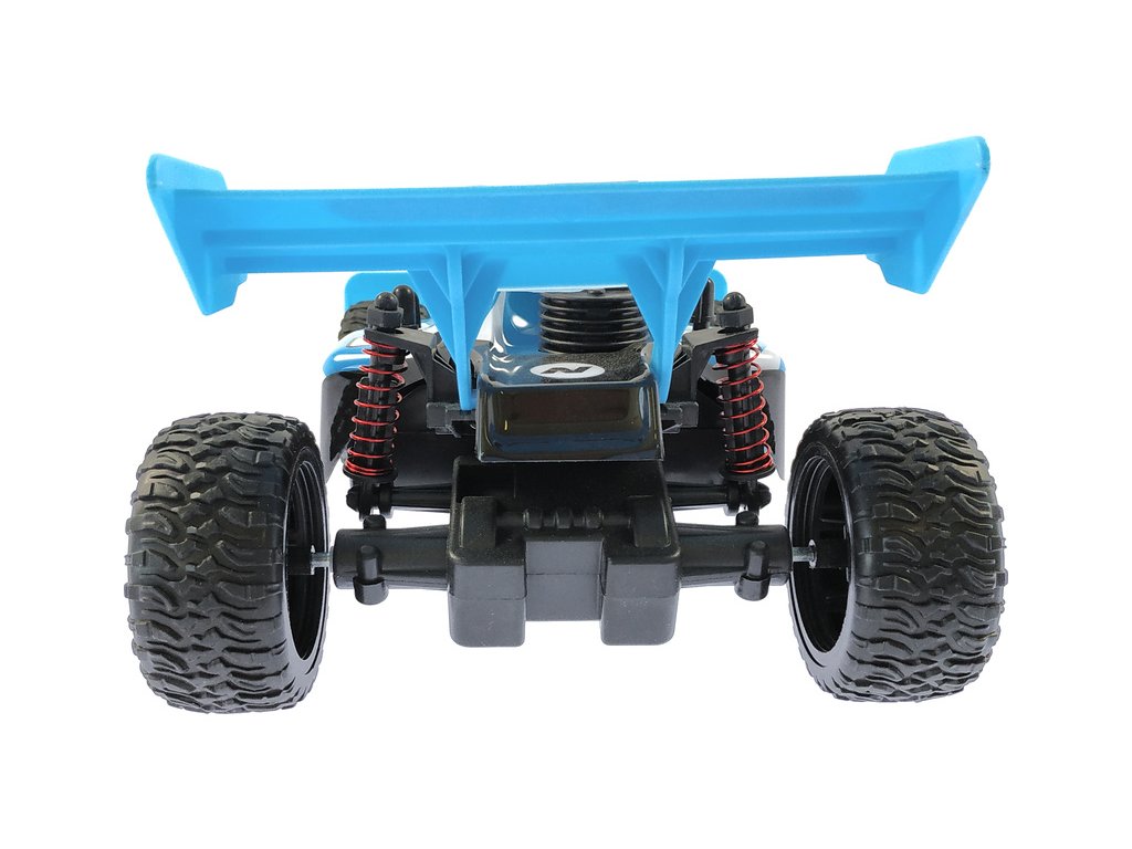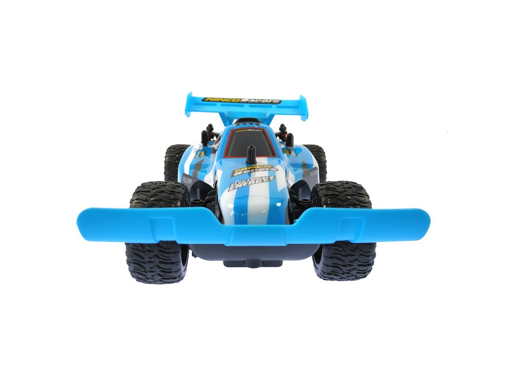 Parádní RC hračka v podobě terénní buggy Nincoracers Stream+ v měřítku 1:18 s délkou téměř 27 cm potěší všechny děti. Díky větším rozměrů model lepé překonává nerovnosti v terénu. V předu je opatřen ochranným nárazníkem a vzadu přítlačným křídlem. Velká kola v kombinaci s pružinovými tlumiči skvěle kopírují terén. Karoserie je z odolného plastu. Má zářivě modrou barvu v kombinaci s bílými pruhy. Zbarvení připomíná tok řeky-Stream. Výborný design podtrhují červené pružiny tlumičů a červené pásky na ráfcích kol. Model jede rychlostí až 15 km/h. Model je na tužkové baterie.