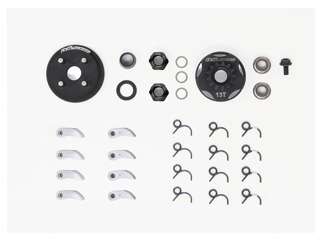 Čtyřdílná spojka vyvinutá pro 1/8 OFF-ROAD podvozky. Kombinace dvou typů spojkových čelistí, matic setrvačníku a tří typů pružin spojky umožňuje jemné nastavení podle rozložení a podmínek povrchu dráhy. Ve srovnání s běžnou třídílnou spojkou je spínaní spojky plynulejší a má výhodu, pokud jde o účinnost paliva.