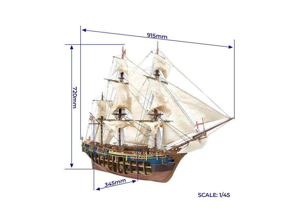 Stavebnice neplovoucího modelu lodi OCCRE HMS Bounty, v měřítku 1:45. V balení jsou díly pro stavbu + plachty - laserem řezané díly, lišty, mosazné fotolepy, lanoví a další. Stavební výkresy a návod.