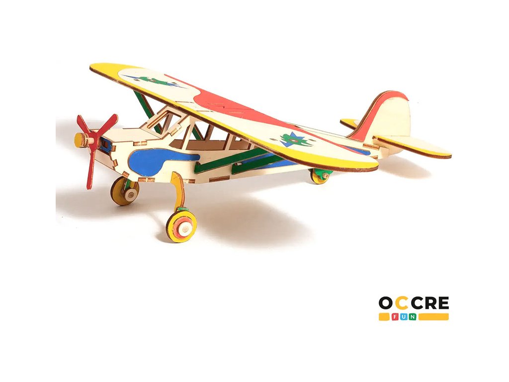 Stavebnice pro děti OCCRE Letadlo Falcon. Balení obsahuje: předřezané dřevěné díly, akrylové barvy a štětec, gumičky pro sestavení, bílé lepidlo, barevný ilustrovaný návod krok za krokem.