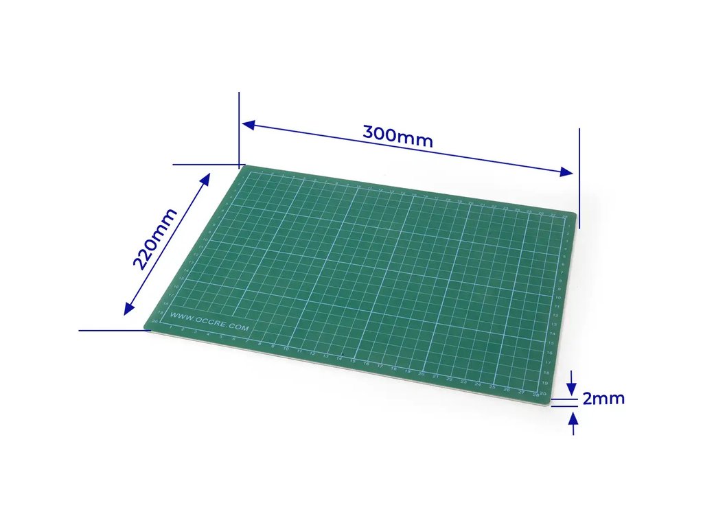 OCCRE řezací podložka o rozměrech 30x22cm a síle 2mm. Obsahuje natištěný čtvercový rastr se stupnicemi v centimetrech (28x20cm). Podložka chrání břity čepelí a zajistí přesný řez. Poskytuje výbornou ochranu pracovnímu stolu. Ideální pro řemeslníky, modeláře a tvůrčí práce.