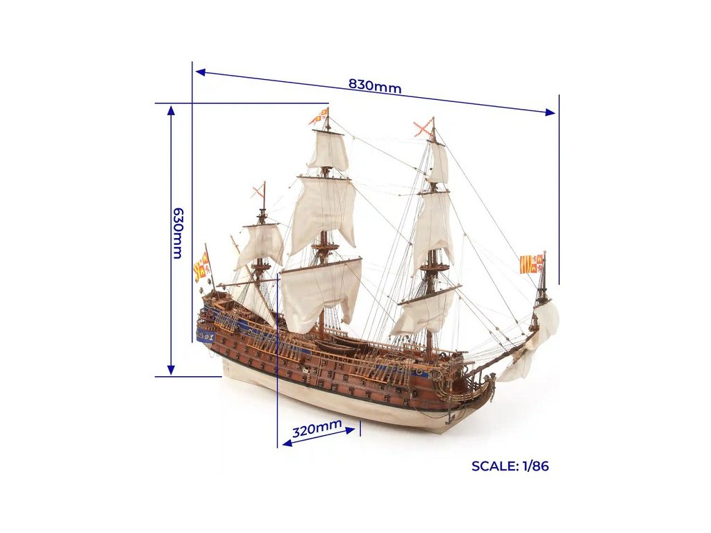 Stavebnice neplovoucího modelu lodi OCCRE San Felipe, v měřítku 1:86. V balení jsou díly pro stavbu + plachty - laserem řezané díly, lišty, mosazné fotolepy, lanoví a další. Stavební výkresy a návod.