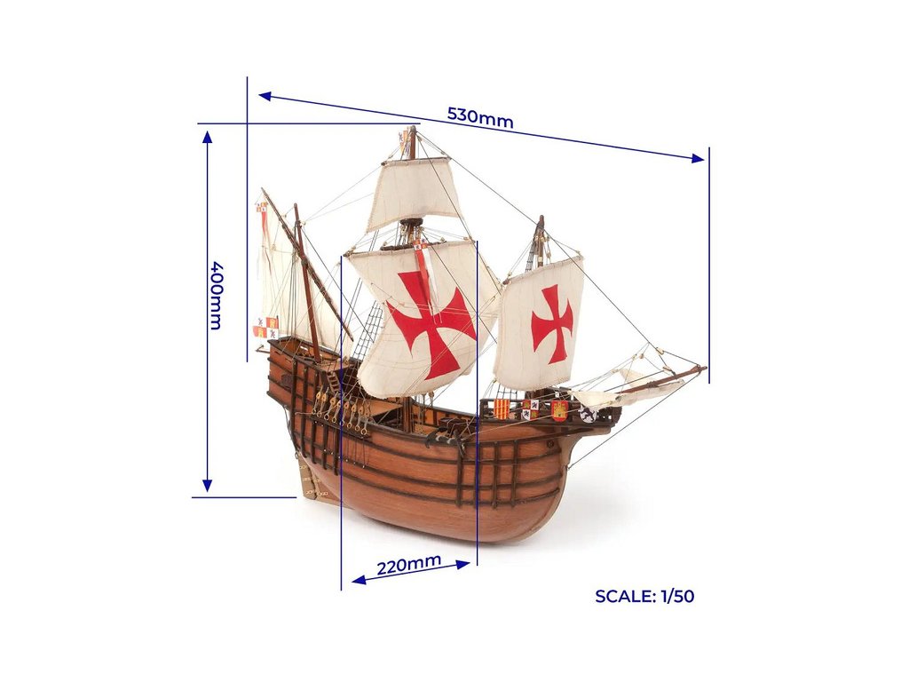 Stavebnice neplovoucího modelu lodi OCCRE Santa Maria, v měřítku 1:50. V balení jsou díly pro stavbu + plachty - laserem řezané díly, lišty, mosazné fotolepy, lanoví a další. Stavební výkresy a návod.