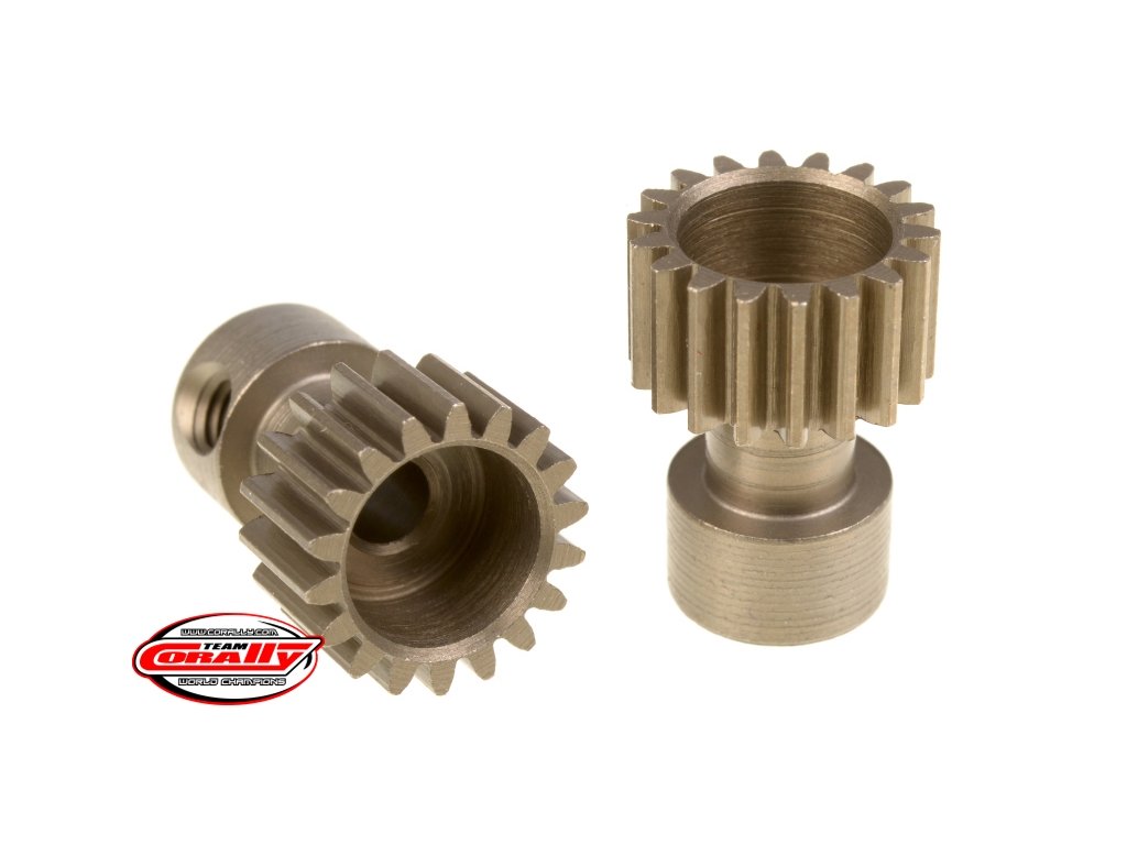 Dlouhé provedení, materiál tvrzená ocel, 18 zubů, modul ozubení 48DP. Pro hřídel motoru o průměru 3.17 mm (1/8 in). Pastorky TEAM CORALLY jsou vyráběny frézováním a následně tvrzeny, čímž je zajištěna vysoká přesnost ozubení. Všechny pastorky TEAM CORALLY jsou vyrobeny v EU.