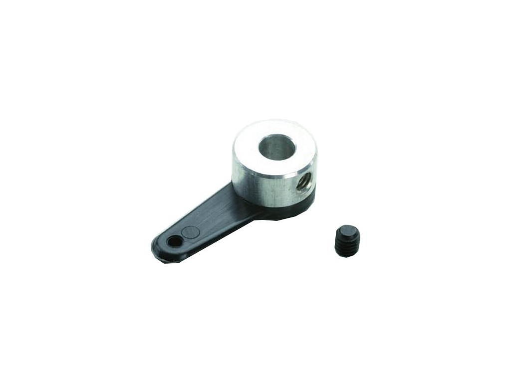 Páka řízení plastová 16mm s hliníkovým nábojem s otvorem o průměru 4mm a zajišťovacím červíkem M3. Celková délka 23,5mm, výška 7mm, náboj má průměr 9,5mm.