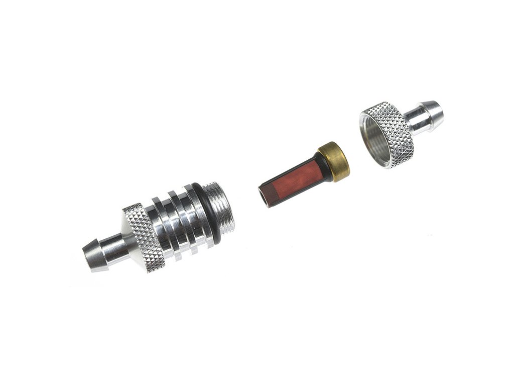 Palivový filtr car hliníkový s kovovým jemným sítkem. Rozměry: délka celk. 31mm, průměr 10mm, hadicová koncovka 5/4mm, délka těla filtru cca 18mm.