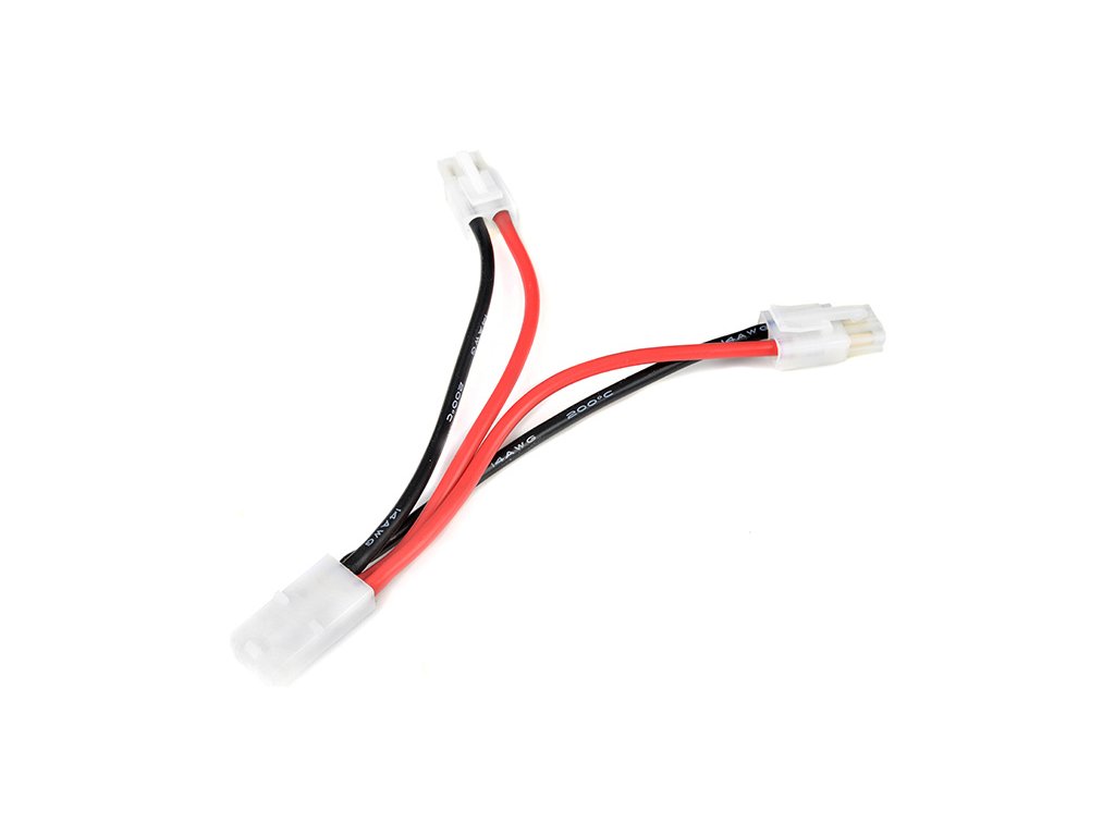 Paralelní Y-kabel s konektory Tamiya a kabely 14AWG, délka 12cm. Dva přístrojové (pro baterie) a jeden bateriový konektor (do regulátoru). Vedle sebe se mohou zapojovat pouze akumulátory stejného typu, stejného napětí a stejné kapacity!