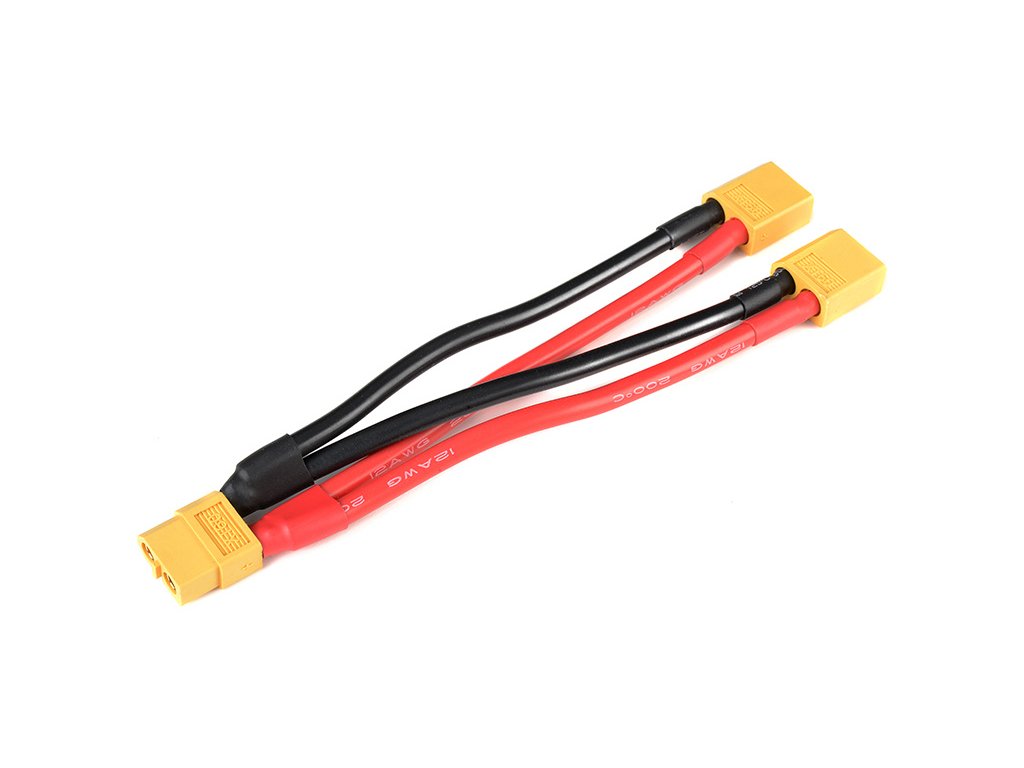 Paralelní Y-kabel s konektory XT-60 a kabely 12AWG, délka 12cm. Dva přístrojové (pro baterie) a jeden bateriový konektor (do regulátoru). Vedle sebe se mohou zapojovat pouze akumulátory stejného typu, stejného napětí a stejné kapacity!