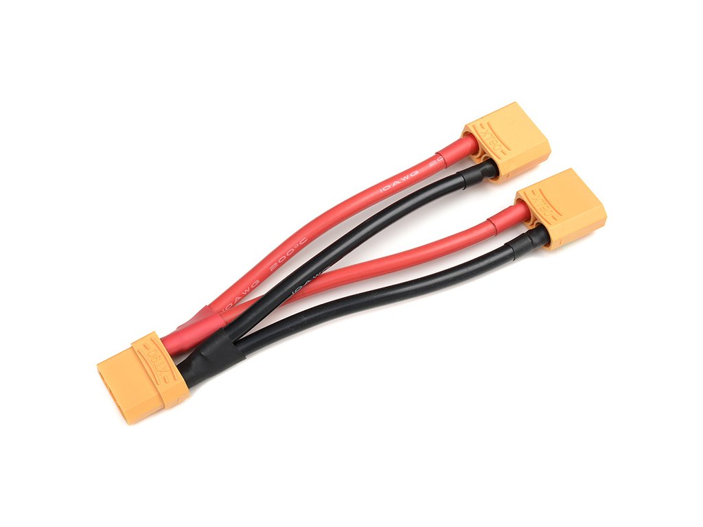 Paralelní Y-kabel s konektory XT-90 a kabely 10AWG, délka 12cm. Dva přístrojové (pro baterie) a jeden bateriový konektor (do regulátoru). Vedle sebe se mohou zapojovat pouze akumulátory stejného typu, stejného napětí a stejné kapacity!