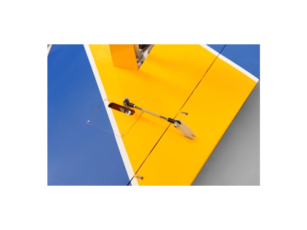 Dvoudílné křídlo se souměrným profilem je klasické konstrukce s balsovými žebry a tuhým potahem. Poloviny křídla se nasazují z boku na dvě duralové trubkové spojky. Křidélka i štěrbinové vztlakové klapky jsou ovládány vždy párem serv umístěných v křídle.