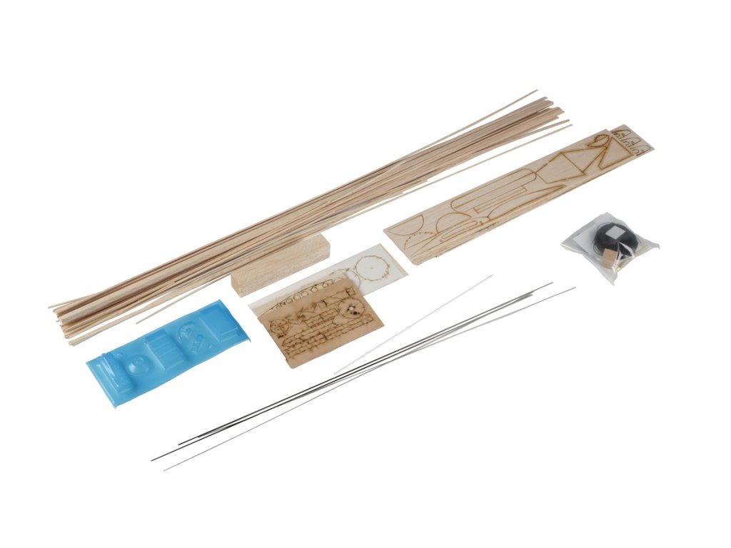 Stavebnice obsahuje: balsové laserem vyřezávané díly, balsové nosníky, vakuově lisované díly (maketu motoru...), ocelovou strunu na podvozek a další drobné díly, lehká kola, potahový papír, aršík samolepek, stavební plán.