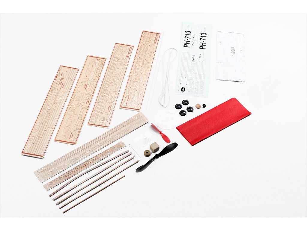 Stavebnice obsahuje: balsové laserem vyřezávané díly, balsové nosníky, vakuově lisované maketové díly (kryt motoru...), plastovou vrtuli s hřídelí a hlavicí, gumový svazek (guma 5x1mm), plastová kola, ocelovou strunu na podvozek a další drobné díly, potahový papír, aršík mokrých obtisků, stavební plán.