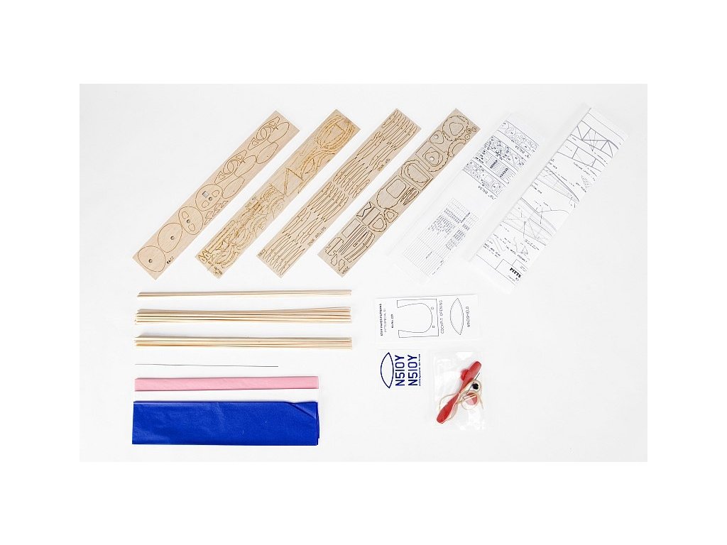 Stavebnice obsahuje: balsové laserem vyřezávané díly, balsové nosníky, plastovou vrtuli s hřídelí a hlavicí, gumový svazek (soutěžní guma FAI TAN II), kola, ocelovou strunu na podvozek a další drobné díly, barevný potahový papír, aršík samolepek, stavební plán.