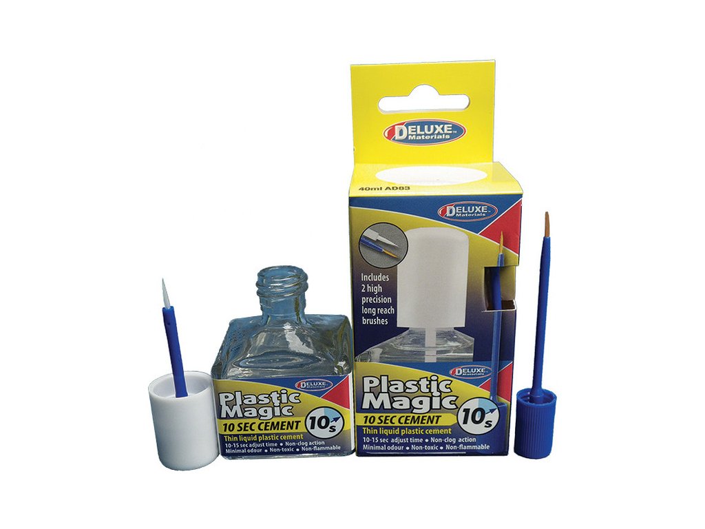 Novinka roku 2018 - populární lepidlo Deluxe Materials Plastic Magic nově s dobou tuhnutí 10 sekund. Lepidlo je netoxické, nedráždivé a díky době tuhnutí 10 sekund se hodí pro plastikové modelářství, modelovou železnici a podobně. Obsah 40 ml. Lepí plasty na bázi styrenu ((PS, HPS, PPS, naleptáním ploch.)