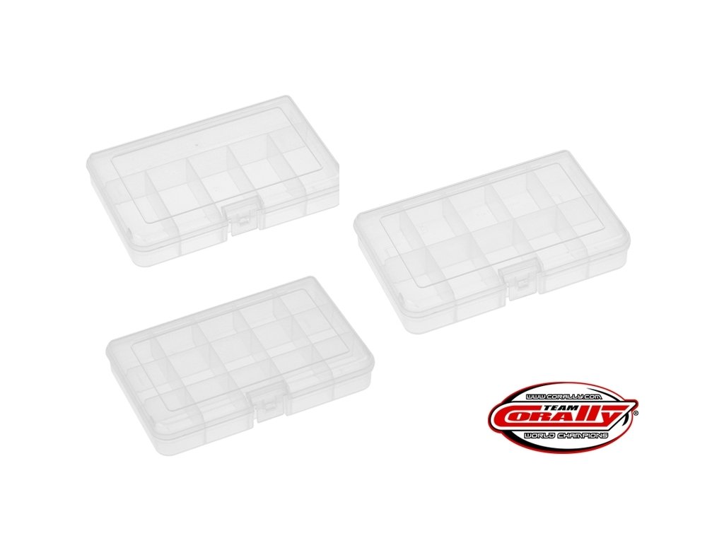 Sada tří středně velkých plastových organizérů Team Corally s přihrádkami pro drobné díly a pod. Je vyroben z houževnatého plastu. Rozměry 165 x 112 x 31 mm.