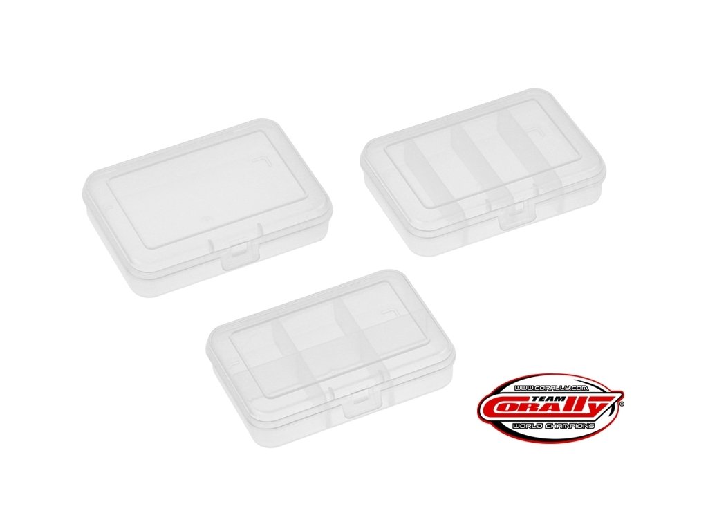 Sada tří středně velkých plastových organizérů Team Corally s přihrádkami pro drobné díly a pod. Je vyroben z houževnatého plastu. Rozměry 91 x 66 x 21 mm.