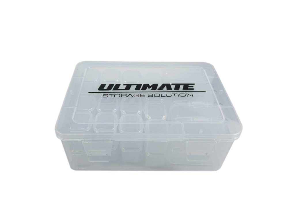 Pevný, odolný, průsvitný box o rozměrech 165x120x60 mm obsahuje 5 vnitřních boxů o rozměrech 55x55x20 mm a 32 boxů o rozměrech 24x20x24 mm se samostatným uzamykatelným víkem pro rychlé a snadné uložení dílů.