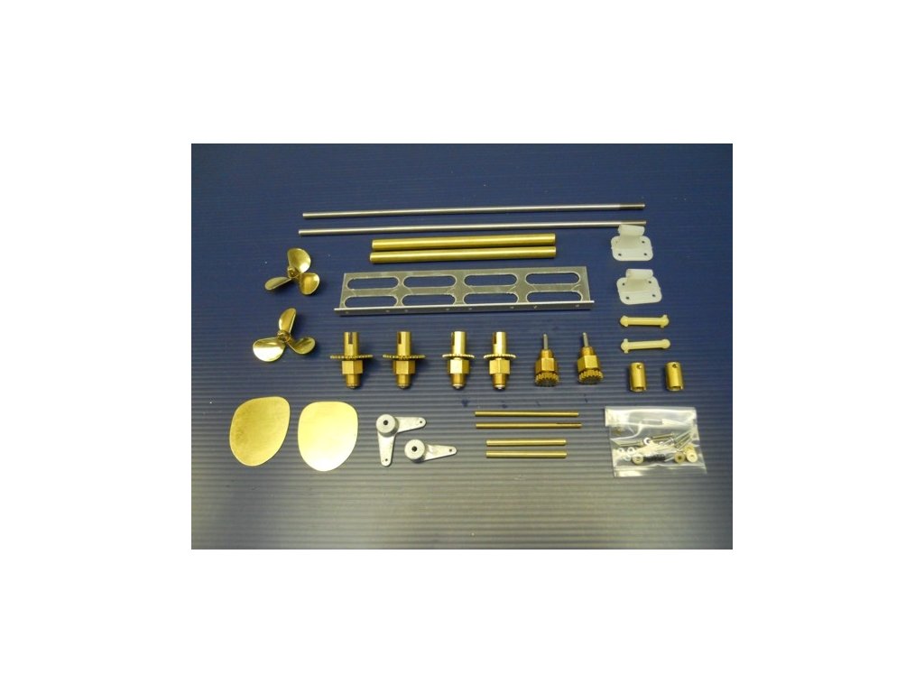 Pohonná sada pro modely Dumas Trojan Cruiser a USCG 44' záchranný člun. Obsahuje: 2x hřídel s pouzdrem, sadu převodů, 2x kormidlo, sadu pák, 2x kardan. spojky, 2x 3listý mosazný lodní šroub.
