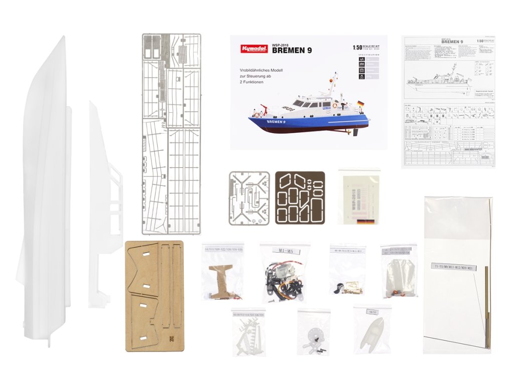 Stavebnice německého policejního člunu o délce 308 mm v měřítku 1:50 v rozsypu. Plastový trup a nástavby, množství plastových maketových detailů, kovových fotoleptaných dílů a další hotové příslušenství umožňují snadnou a rychlou stavbu.