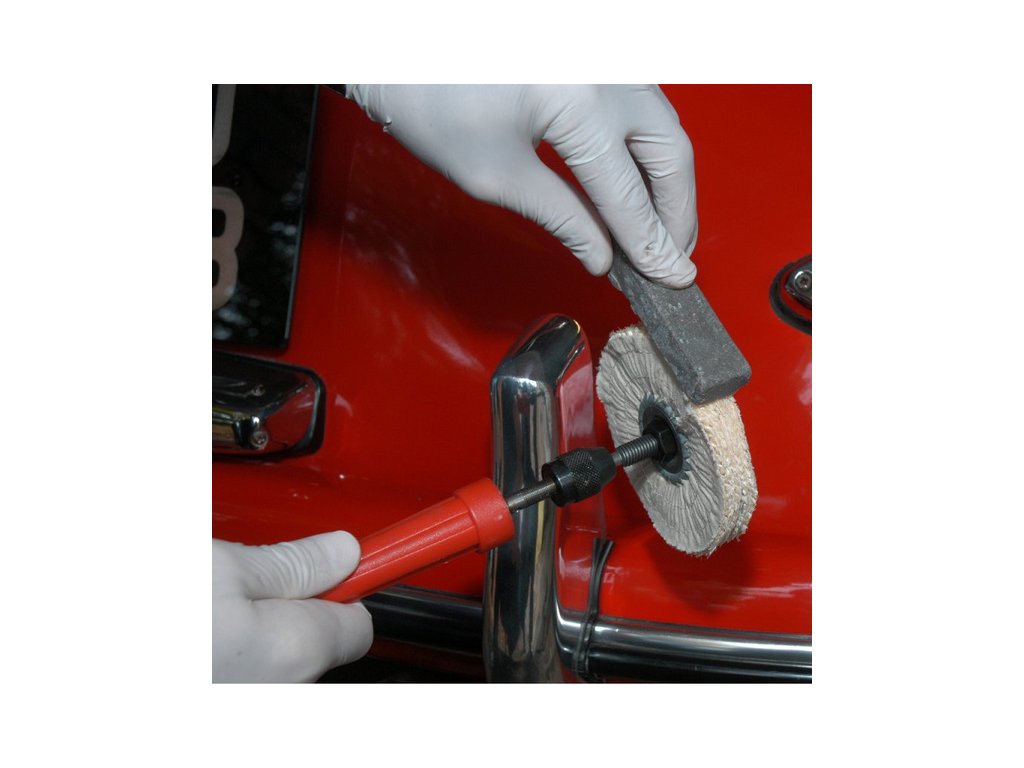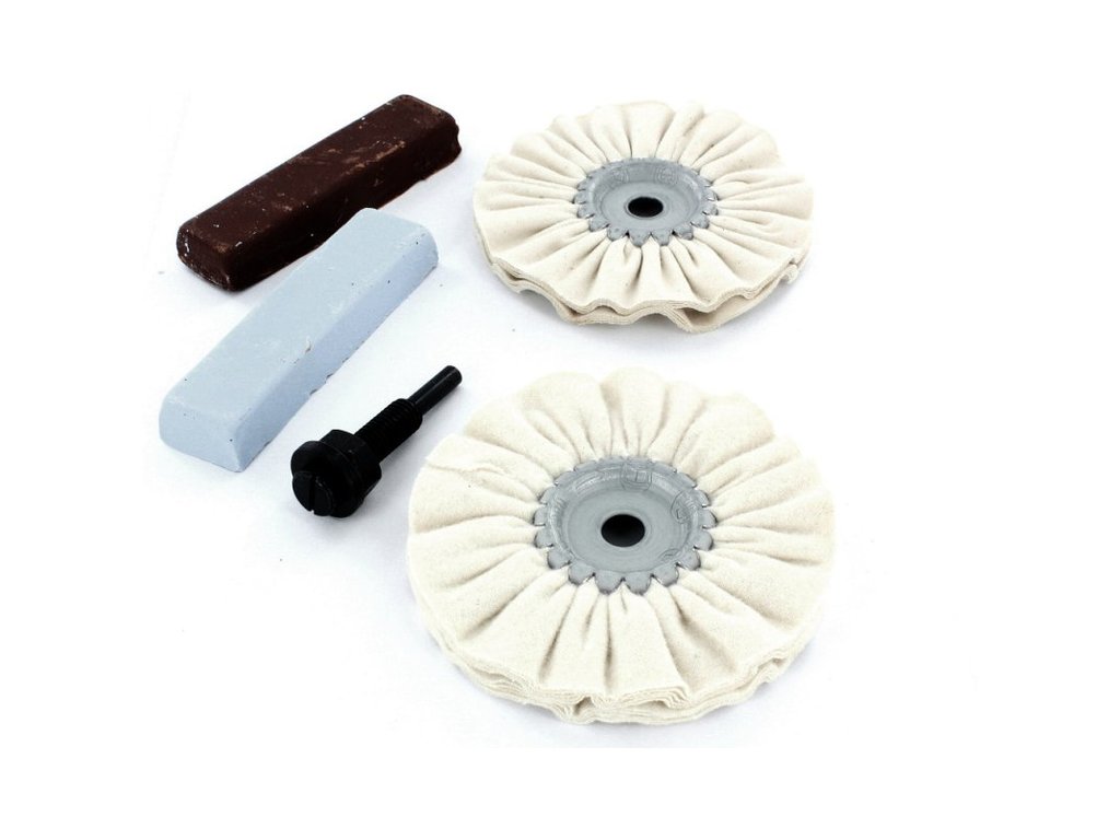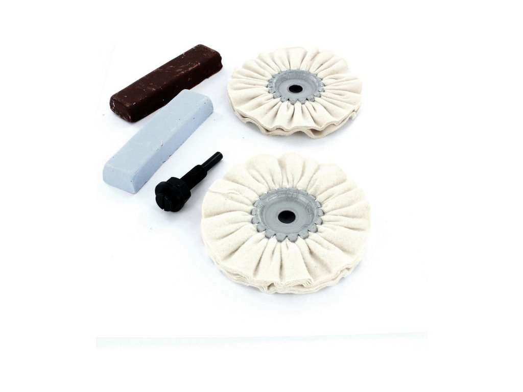 Sada na leštění mosazi a mědi. Policraft lešticí sada DIY vhodná pro domácí a modelářské použití, obsahuje kompletní součásti k leštění. Kotouč 100mm tvrdý (pro předleštění), kotouč 100mm měkký (pro finální leštění), upínací stopku (unašeč), hnědou leštící pastu pro hrubé a modrou pro jemné leštění. Vytvářejte profesionální povrchovou úpravu materiálů s touto sadou. Stopkový unašeč s instalovaným kotoučem můžete upnout do ručního nářadí s klasickým sklíčidlem nebo závitem pro Flexi náhony.