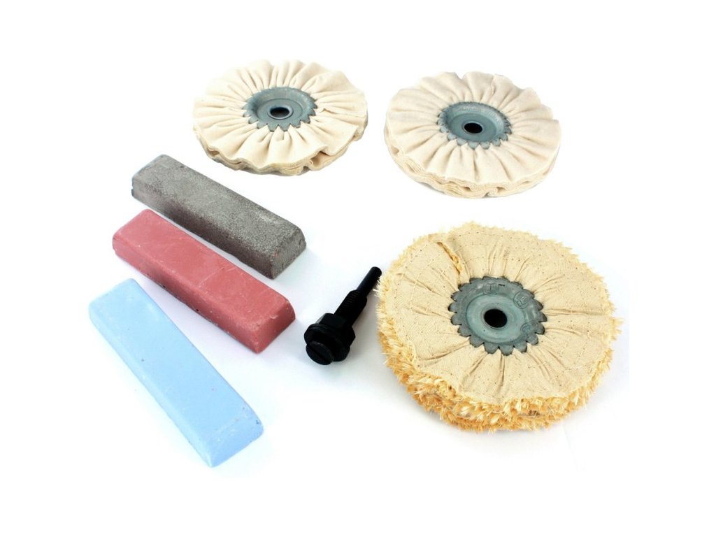 Sada na leštění nerezové oceli. Policraft lešticí sada DIY, obsahuje kompletní součásti k leštění. Kotouč 2-sekční sisálový (první fáze), kotouč 100mm tvrdý (pro předleštění), kotouč 100mm měkký (pro finální leštění), upínací stopku (unašeč), šedou tyčinku pro hrubé leštění, růžovou pro jemné leštění a modrou pro vysoký lesk. Vytvářejte profesionální povrchovou úpravu materiálů s touto sadou. Stopkový unašeč s instalovaným kotoučem můžete upnout do ručního nářadí s klasickým sklíčidlem nebo závitem pro Flexi náhony.