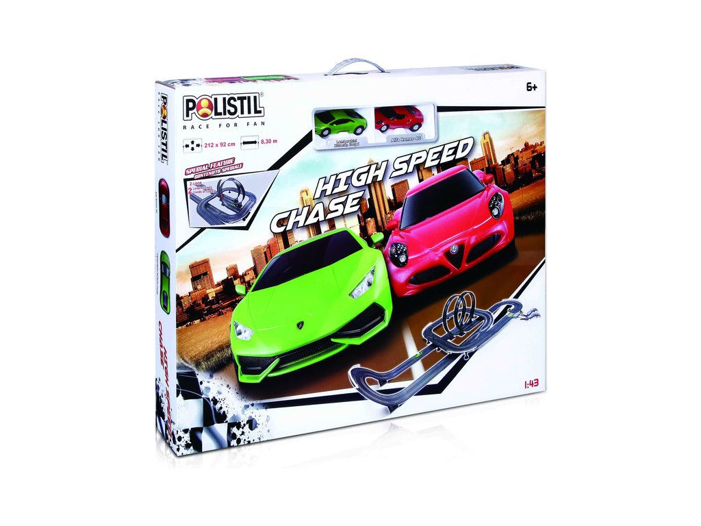 Polistil High Speed Chase - analogová elektrická autodráha v měřítku 1:43. Důmyslná tratě s mostem, loopingem, klopenou zatáčkou, křížením a počítadlem. Autíčka Alfa Romeo a Lamborghini. Délka tratě 8,3m, plocha pro rozložení 212 x 92cm. Přiložen síťový zdroj 12V