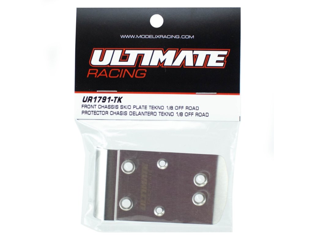 Přední ochranná deska podvozku Ultimate Racing pro Tekno 1/8 Off Road. Tato přední deska (skid plate), určená pro platformy NB48 2.0, 2.1 a 2.2, nabízí zvýšenou ochranu podvozku před opotřebením. Je vyrobena z 0,5mm nerezové oceli a je jedním z nejjednodušších způsobů ochrany vašeho vozidla. Balení obsahuje jednu desku stříbrné barvy s laserovým gravírováním Ultimate Skid Plate.