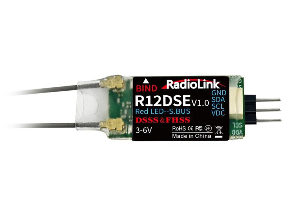 Radiolink R12DSE 2,4GHz je miniaturní 12-kanálový telemetrický přijímač se synchronním přenosem DSSS a FHSS s frekvenčním přeskokem kompatibilní s vysílači Radiolink AT9, AT 9S, AT9S Pro, AT10 a AT10II (vysílače AT9, AT 9S, AT9S Pro a AT10 je možno upgradovat na 12 kanálů aktualizací jejich firmwaru, který si můžete stáhnout na stránkách výrobce http://radiolink.com.cn/doce/at10upgraded.html - AT10II je 12-kanálový již v základní verzi). R12DSE nabízí přepínatelný sériový výstup S-BUS nebo PPM.