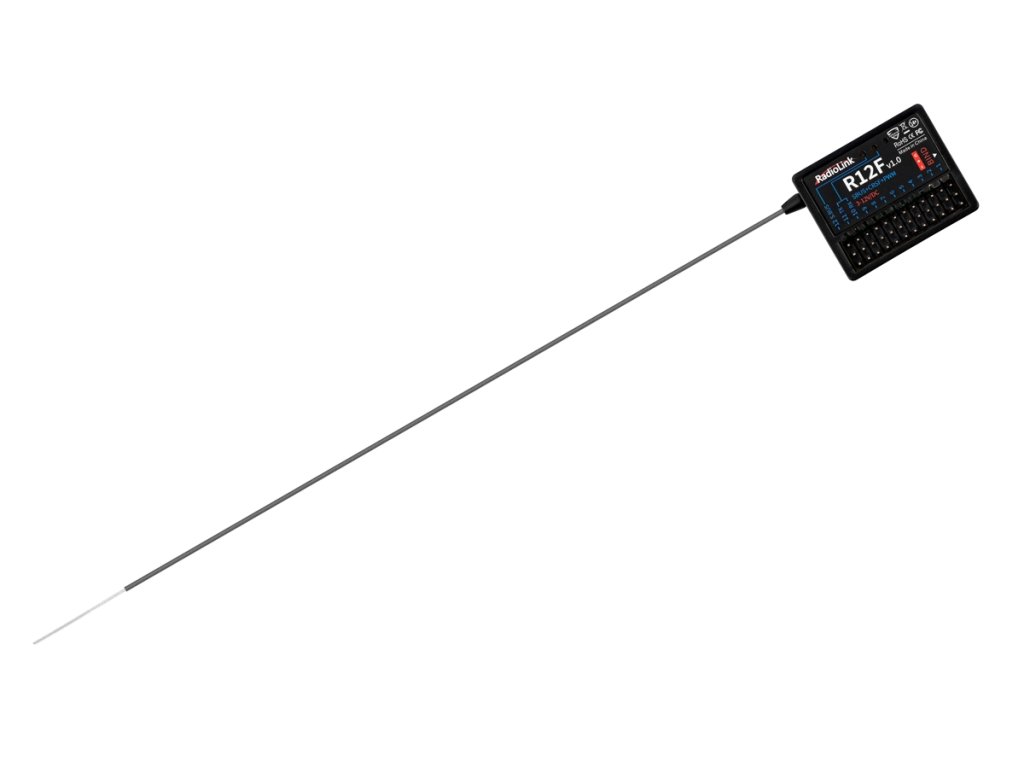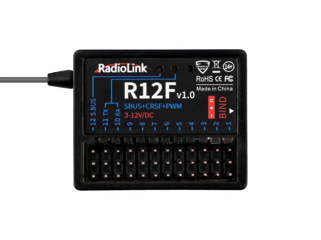 Radiolink R12F 2,4GHz je 12kanálový přijímač FHSS s frekvenčním přeskokem bez telemetrie kompatibilní s vysílači Radiolink T12D a T16D. Nabízí čtyři provozní režimy: