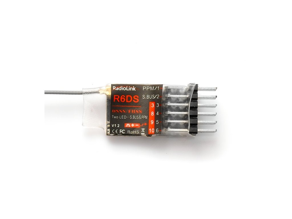 Radiolink R6DS 2,4GHz je malý 6-kanálový přijímač se synchronním přenosem DSSS a FHSS s frekvenčním přeskokem kompatibilní s vysílači Radiolink AT9, AT 9S, AT10 a AT10II (AT10II je nutno přepnout do režimu vysílání 10CH). Nabízí dva provozní režimy – se standardními šířkově modulovanými (PWM) signálovými servo výstupy (6 kanálů) nebo se sériovými výstupy S-BUS+PPM (10 kanálů). NENÍ kompatibilní s vysílači Radiolink T8FB a T8S.