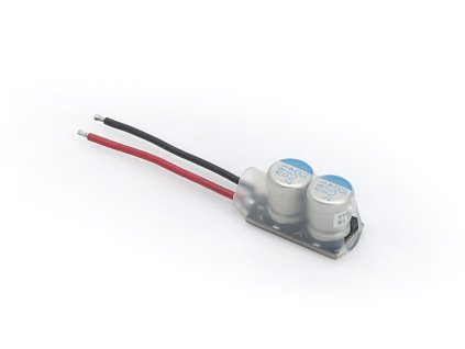 2x 470uf, napětí: 16V, vnitřní odpor: 0,004 Ohm, dynamické zatížení: 12,2A, rozměry: 31x13,6x15,2mm bez kabelů, váha 5g, k použití jak pro 1 i 2s LiPo sady.
