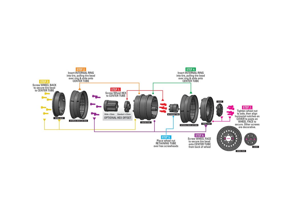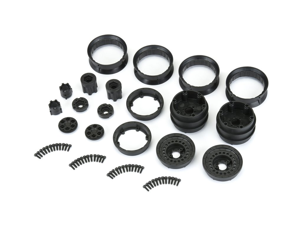 Balení obsahuje 2x disk, 2x středový spojovací kroužek, 2x držák Beadlock, 2x Beadlock objímka, 2x úzký adaptér unašeče, 2x široký adaptér unašeče, 2x zajišťovací kroužek matice, 2x kryt zajišťovacího kroužku, 48x šroub M2.5 x 8 SHCS.