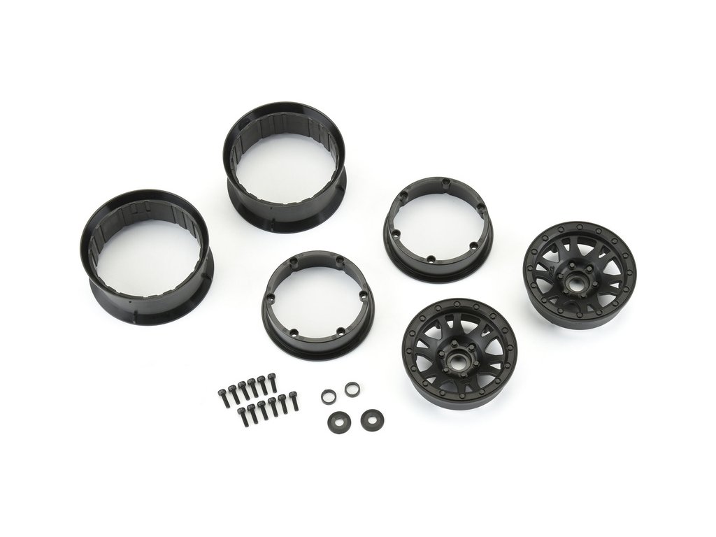 Balení obsahuje (2ks) Černé plastové kolo Impulse 2,2", (2ks) Černé plastové zadní kolo, (2ks) Černý plastový vnitřní kroužek Bead-Lock, (12ks) M2,5 x 8 SHCS, (4ks) Podložky a podložky adaptéru nápravy.