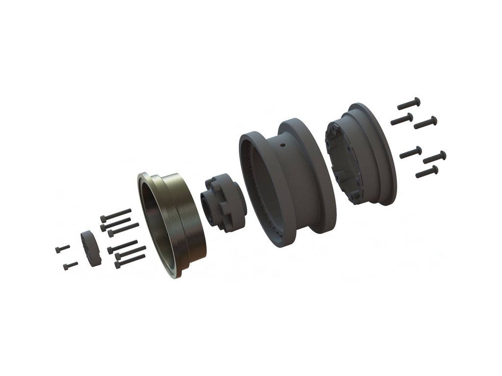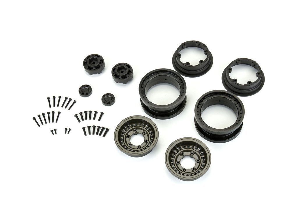 Pro-Line disk 2.9" Black Rhino Armory Gunmetal Aluminum Dual Offset (+5/+10) pro RC auta Axial SCX6 1:6. Oficiálně licencováno společností Black Rhino Wheels, ve vojenském stylu, ideálním pro Off-road. Čelní kryt z hliníku s 24 stavěcími šrouby. Dva offsety pro různé odsazení, šestihran 17mm.
