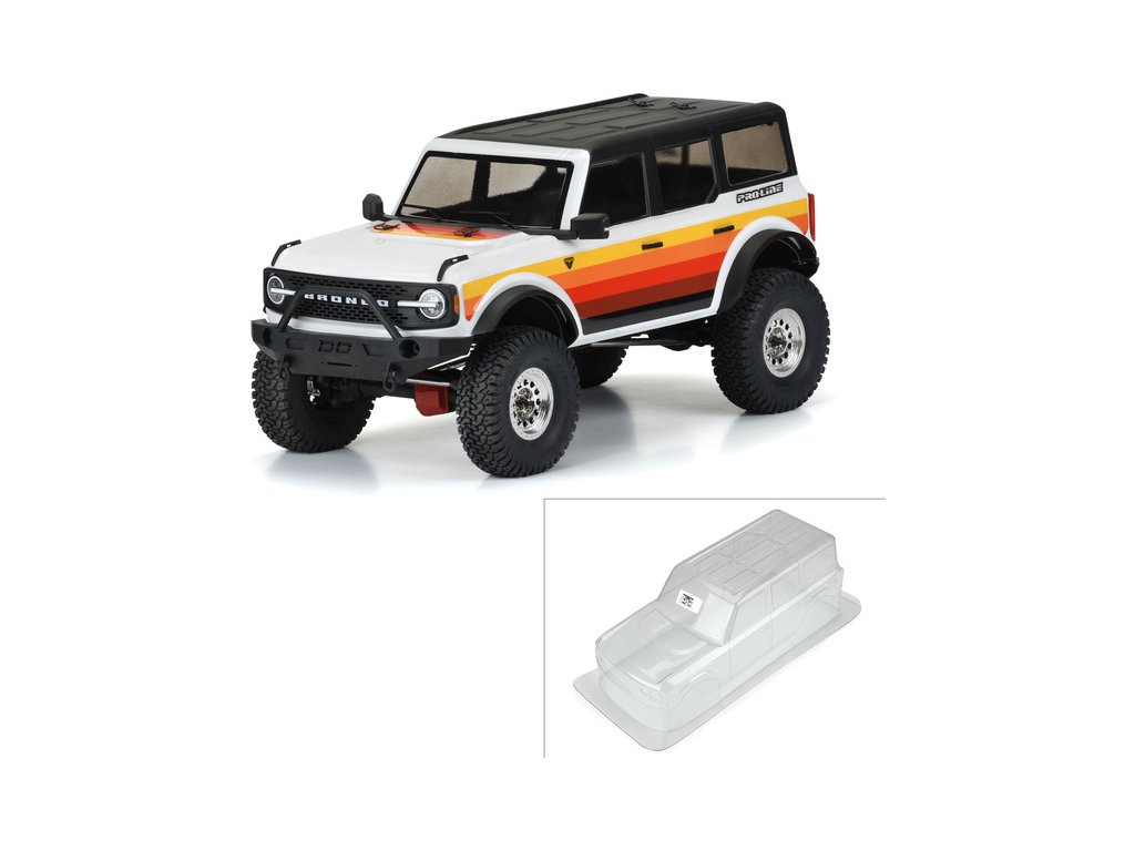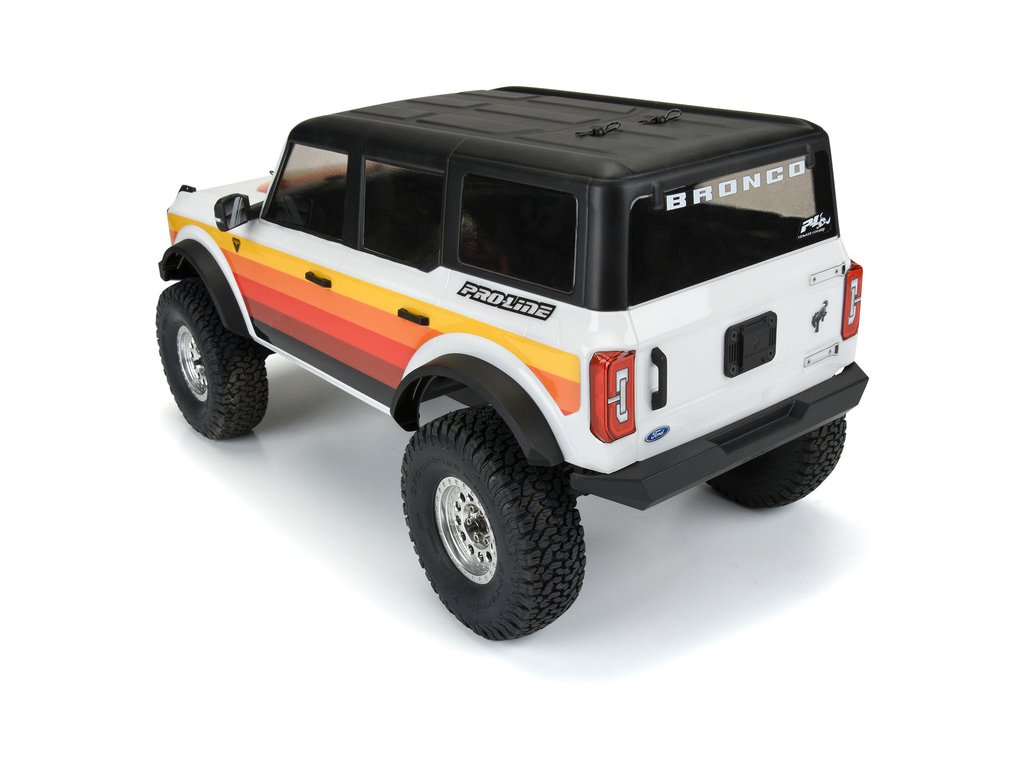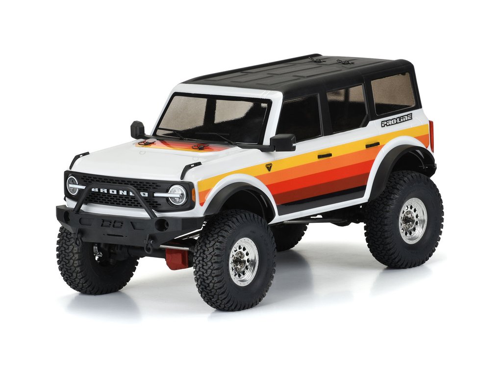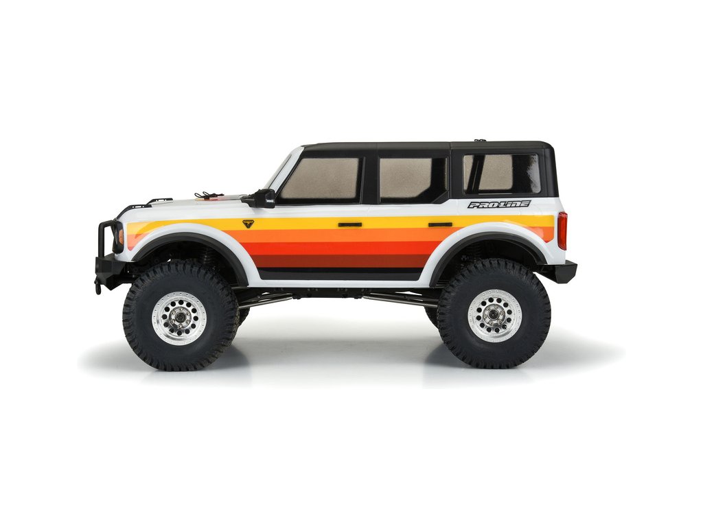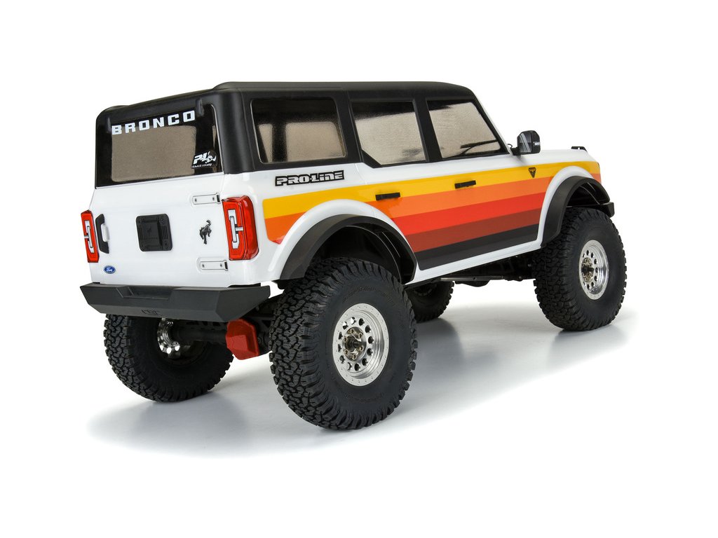 Pro-Line nabízí karosérii Ford® Bronco z roku 2021 s rozvorem 313mm pro klasická kola nebo podvozky s pásy, vybavenou přední mřížkou, světlomety, lištami karoserie a řadou detailů. Arch samolepek obsahuje světla, kliky, loga a nápisy. Karosérie je čirá a obsahuje masku oken. Po nastříkání aplikujte obtisky a máte hotovo. Pro-Line opět zvýšil laťku pro detaily příslušenství na polykarbonátové karoserii, včetně lisované černé plastové přední masky, blatníků, zrcátek, klik dveří a stěračů. Držák náhradního kola vám umožňuje namontovat náhradní pásovou pneumatiku dozadu, zatímco kbelíky předních a zadních světel umožňují osvětlení LED (prodává se samostatně)