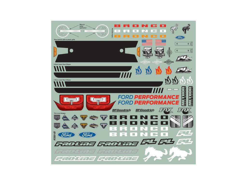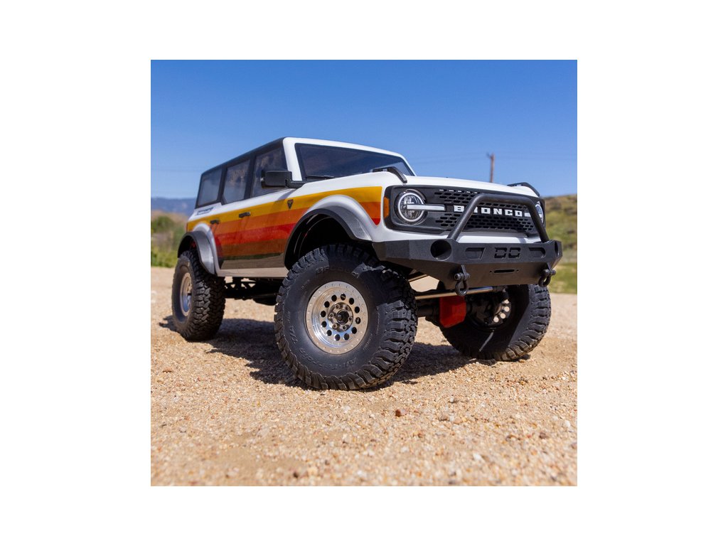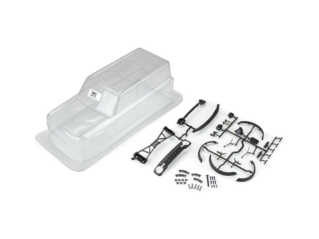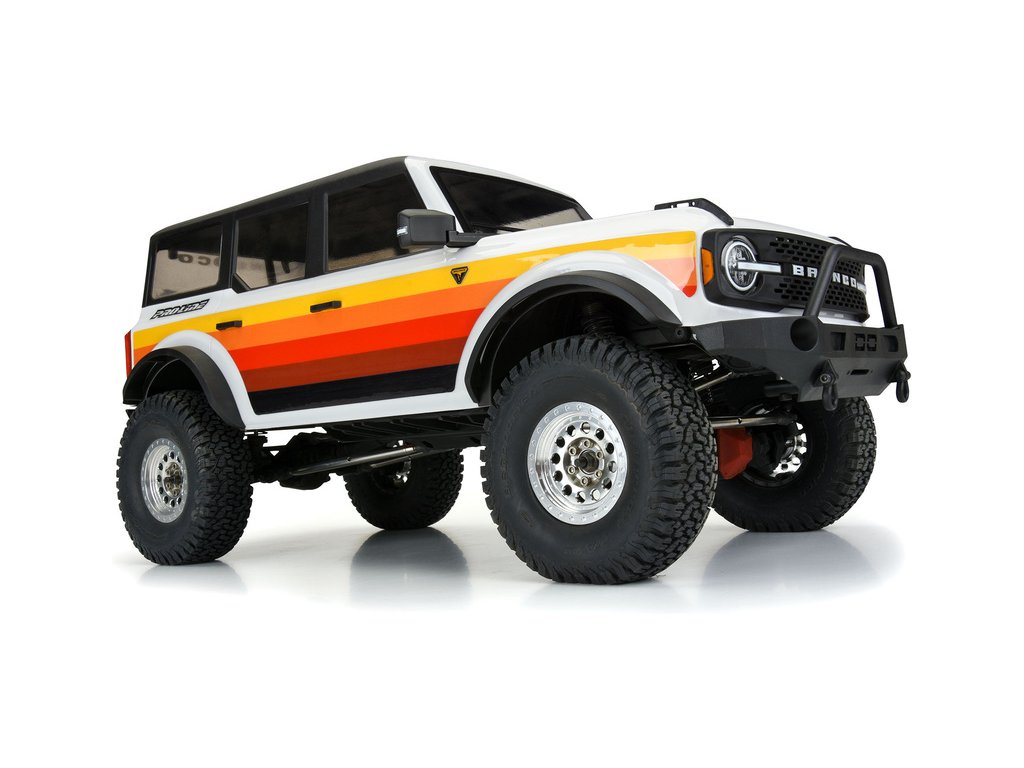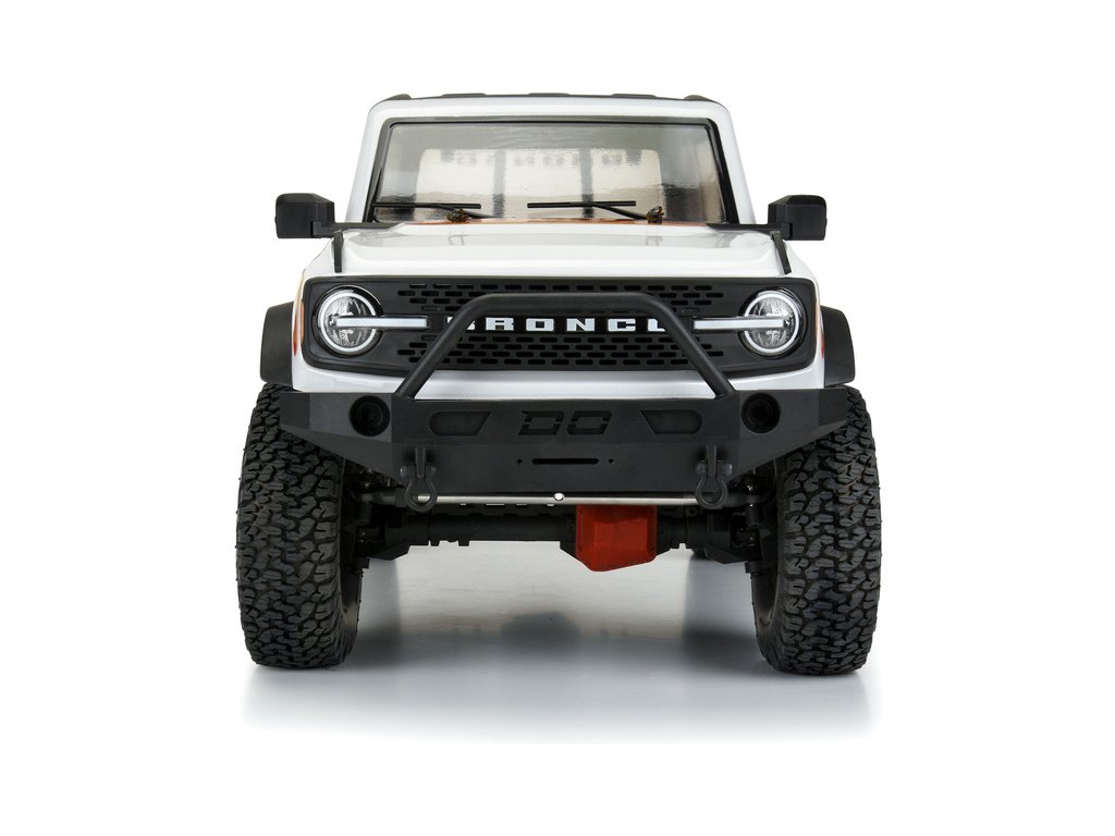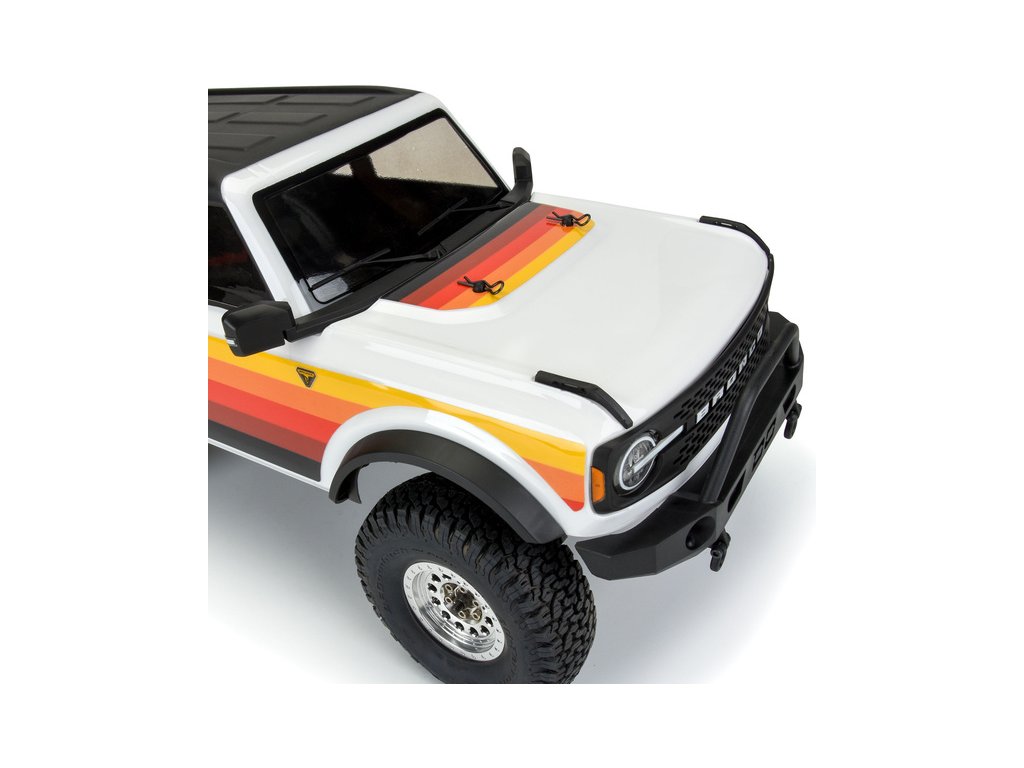 Pro-Line nabízí karosérii Ford® Bronco z roku 2021 s rozvorem 313mm pro klasická kola nebo podvozky s pásy, vybavenou přední mřížkou, světlomety, lištami karoserie a řadou detailů. Arch samolepek obsahuje světla, kliky, loga a nápisy. Karosérie je čirá a obsahuje masku oken. Po nastříkání aplikujte obtisky a máte hotovo. Pro-Line opět zvýšil laťku pro detaily příslušenství na polykarbonátové karoserii, včetně lisované černé plastové přední masky, blatníků, zrcátek, klik dveří a stěračů. Držák náhradního kola vám umožňuje namontovat náhradní pásovou pneumatiku dozadu, zatímco kbelíky předních a zadních světel umožňují osvětlení LED (prodává se samostatně)