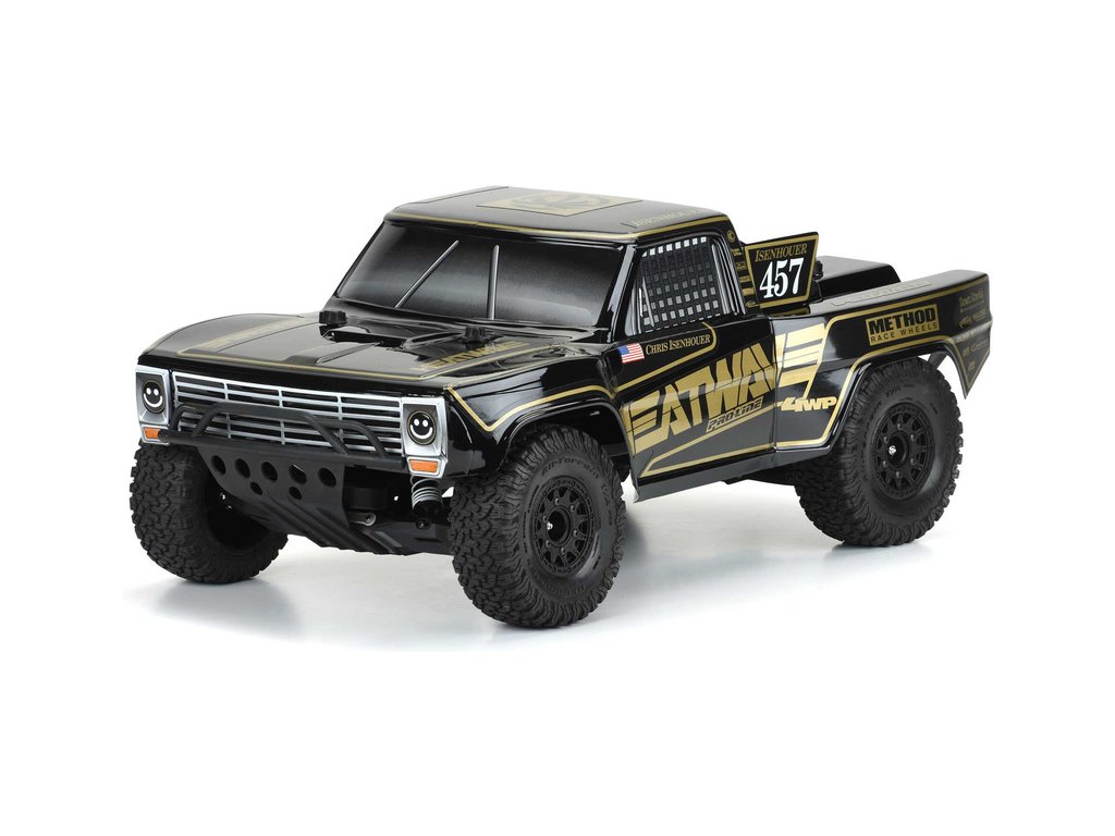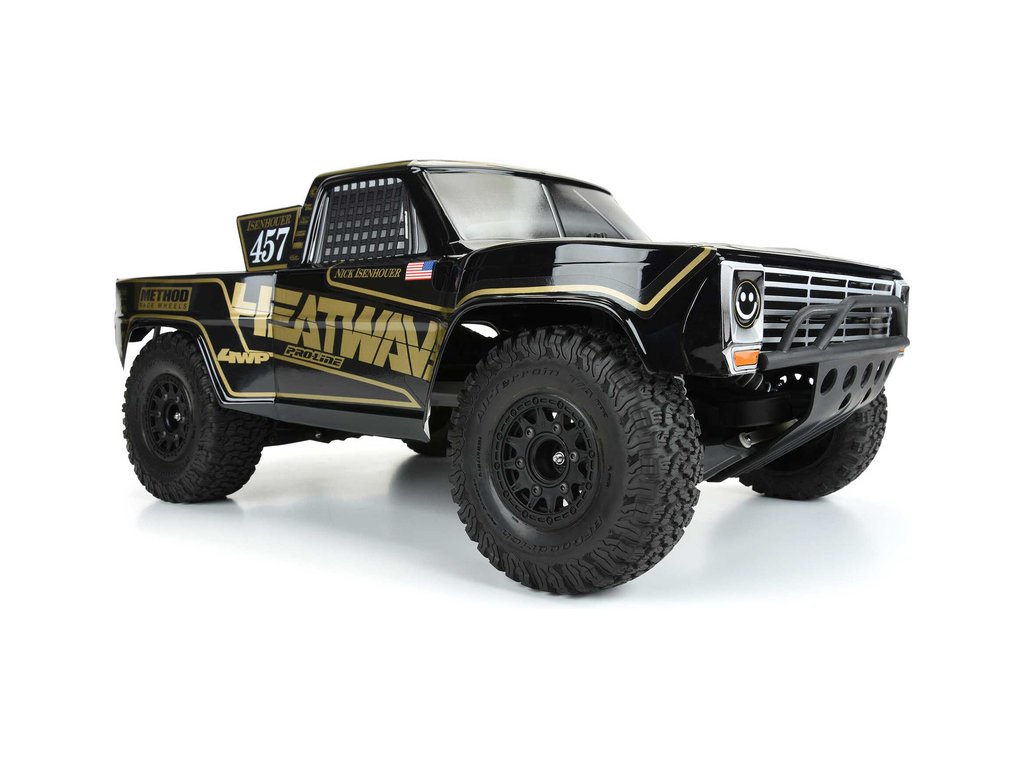 Karoserie se vyznačuje ikonickou plochou přední mřížkou F-100 a širokými lemy blatníků, které reprezentují agresivní sklolaminátové vybouleniny, které se nacházejí na Chrisově závodním stroji. Materiál Pre-Cut Tough-Color Black se nikdy neodlupuje ani neodlupuje a součástí jsou také realistické samolepky na okna! Vše co musíte udělat abyste mohli začít pracovat: odstraňte vnější fólii, umístěte podle přiložených pokynů a nalepte na karosérii. Změňte vzhled svého modelu Short Course a přidejte ještě větší realističnost s plně licencovanou karoserií Ford® F-100 Race Truck Heatwave® Edition z roku 1967 od Pro-Line!