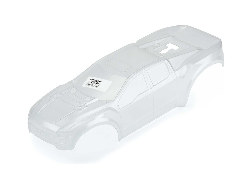 Pro-Line karosérie čirá vyřezaná 2017 Ford F-150 Raptor, pro RC modely aut Rustler 4x4 v měřítku 1:10, rozvor 295mm, délka 422mm, výška 107mm. Vyrobeno z odolného lexanu.