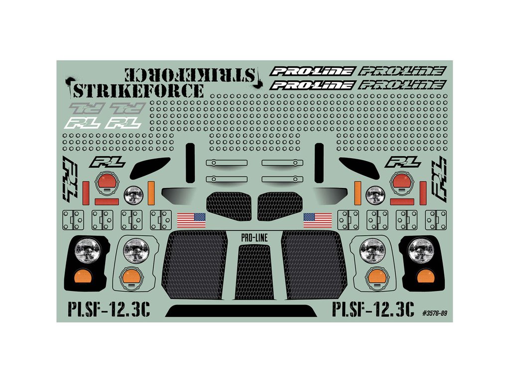 Předloha pro Pro-Line karosérii Strikeforce, je založena na lehkých bojových vozidlech, používaných ozbrojenými salami. Je ideální pro vaši stavbu s vojenskou tématikou pro RC modely aut Crawler. Strikeforce nabící čirou karosérii pro vaši kreativitu a může z něj být univerzální vojenské vozidlo, užitkové vozidlo nebo dokonce nosič zbraní. Strikeforce má detailní tvary přední mřížky, kapoty a střechy, které napodobují reálné stroje a karoserie dokonce obsahuje přídavná neprůstřelná okna a víko vzduchového filtru, které dotváří vojenský vzhled. Obtiskový aršík obsahuje další detaily, díky kterým Strikeforce ožije, jako jsou okenní šrouby a dveřní panty.