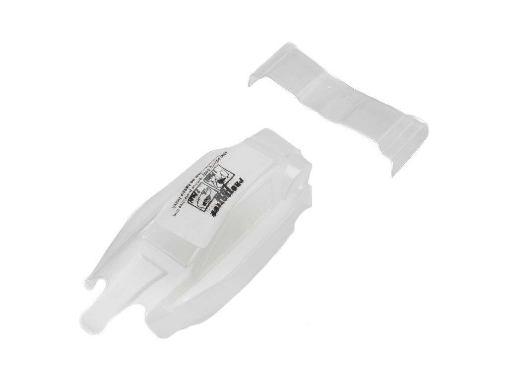 Karosérie čirá, čiré přítlačné křídlo, držák regulátoru, suchý zip, maska oken, samolepky.
