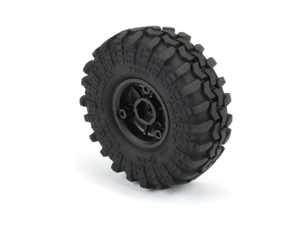 Kompletní smontovaná přední/zadní kola pro RC modely aut 1:24 na podvozku SCX24, se skládá z pneumatiky Pro-Line Super Swamper TSL SX 2.25" a plastového disku 1" Mini Holcomb Black Internal Bead-Loc, s šestihranem H7 černý, 4ks v balení. 3-dílná kola Bead-Lock s pouze 3 šrouby na kolo.