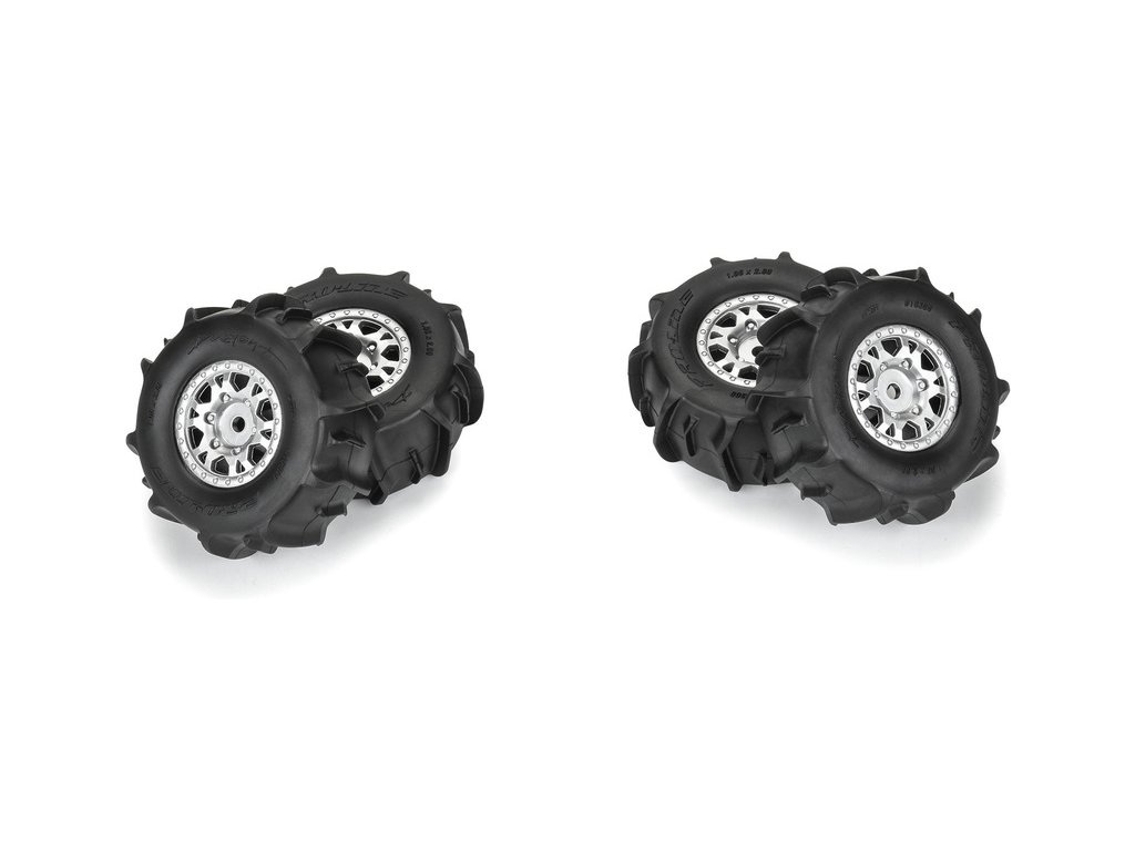 Kompletní kola Pro-Line pro RC modely aut 1:16 Mojave GROM. Rozměr ⌀66x26 mm. Disk má stříbrnou barvu. Pádlové pneumatiky Dumont 1.2". Unašeč je šestihran 12mm. Vložka Open Cell.