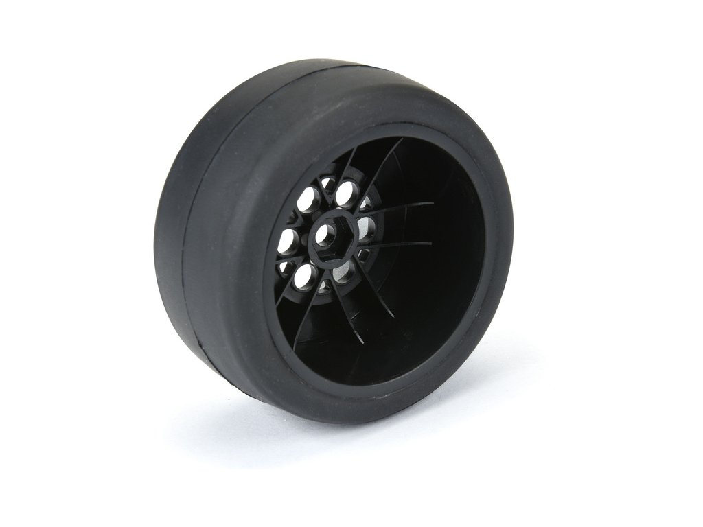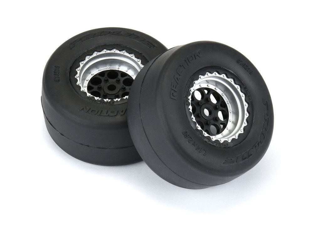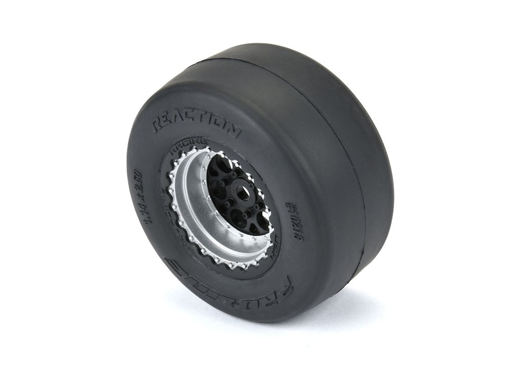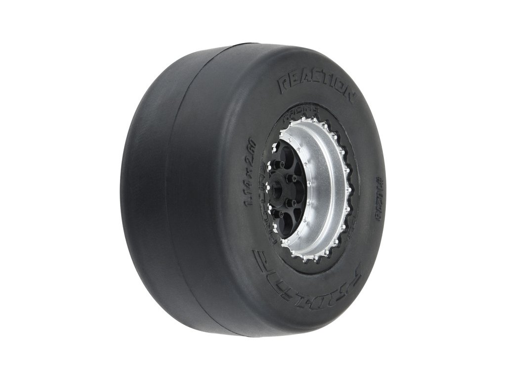 Pro-Line kolo kompletní 1:16, pneumatika Reaction zadní, disk H8 černý/stříbrný (2 ks). Kolo je doporučeno pro RC auta 1:16 Losi® Mini No-Prep Drag Car (LOS01023T1 / LOS01023T2). Šestihran 8mm, pneumatika Reaction je vyrobena ze super měkké směsi a má širší kontaktní plochu pro masivní přilnavost.