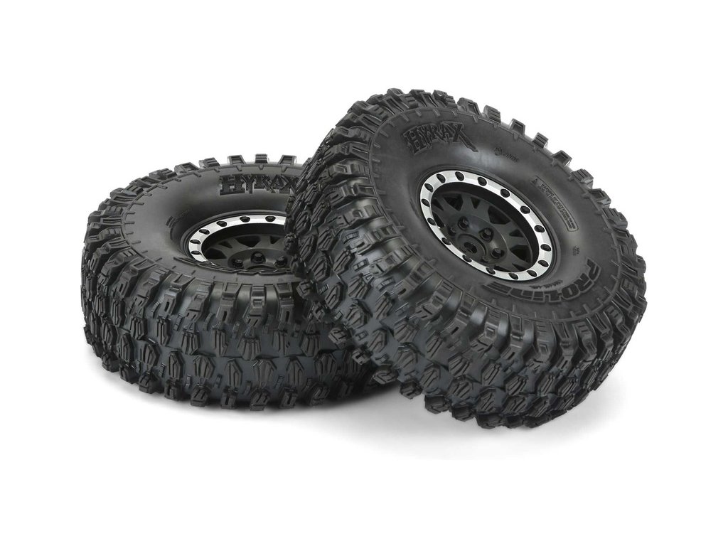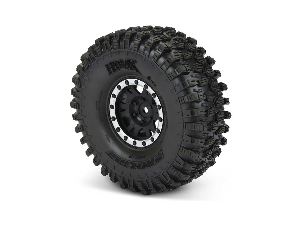 Kompletní kola Pro-Line pro RC modely aut 1:10 crawler, expediční. Rozměr ⌀120x45 mm. Paprskový disk Impulse má černou barvu, stříbrný kroužek. Pneumatiky Hyrax Predator 1.9", tvrdost směsi (extra měkká). Unašeč je šestihran 12 mm.