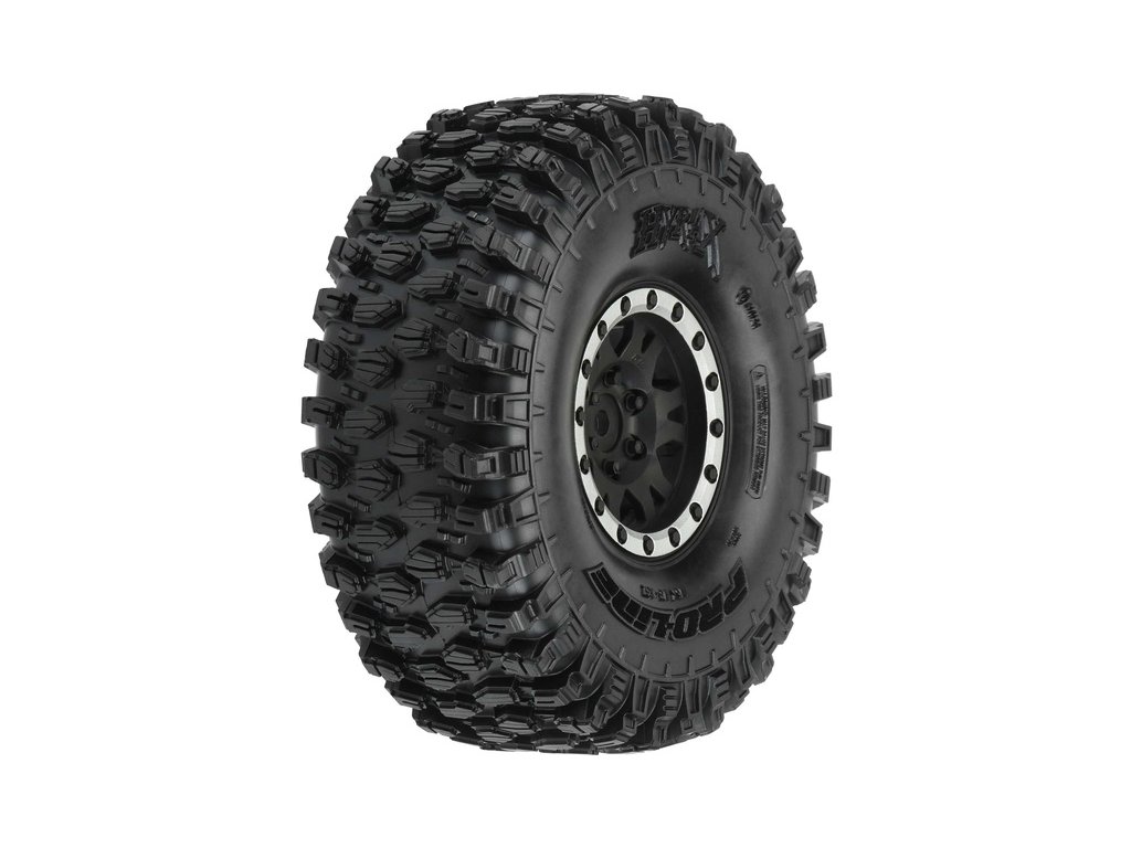 Kompletní kola Pro-Line pro RC modely aut 1:10 crawler, expediční. Rozměr ⌀120x45 mm. Paprskový disk Impulse má černou barvu, stříbrný kroužek. Pneumatiky Hyrax Predator 1.9", tvrdost směsi (měkká). Unašeč je šestihran 12 mm.