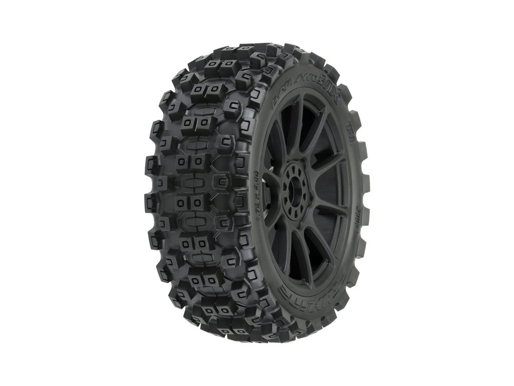 Kompletní kola Pro-Line pro RC modely aut 1:8. Rozměr ⌀120x45 mm. Disk Black Mach 10 má černou barvu. Pneumatiky Badlands MX Buggy, tvrdost směsi M2 (střední). Unašeč je šestihran 17 mm.