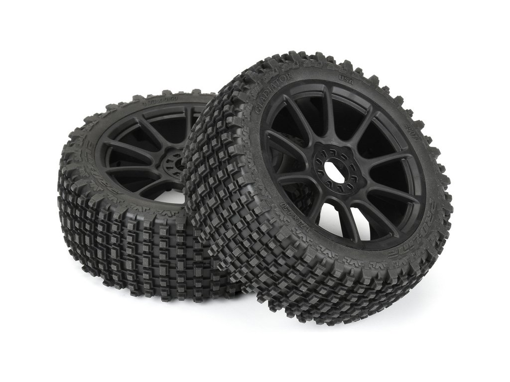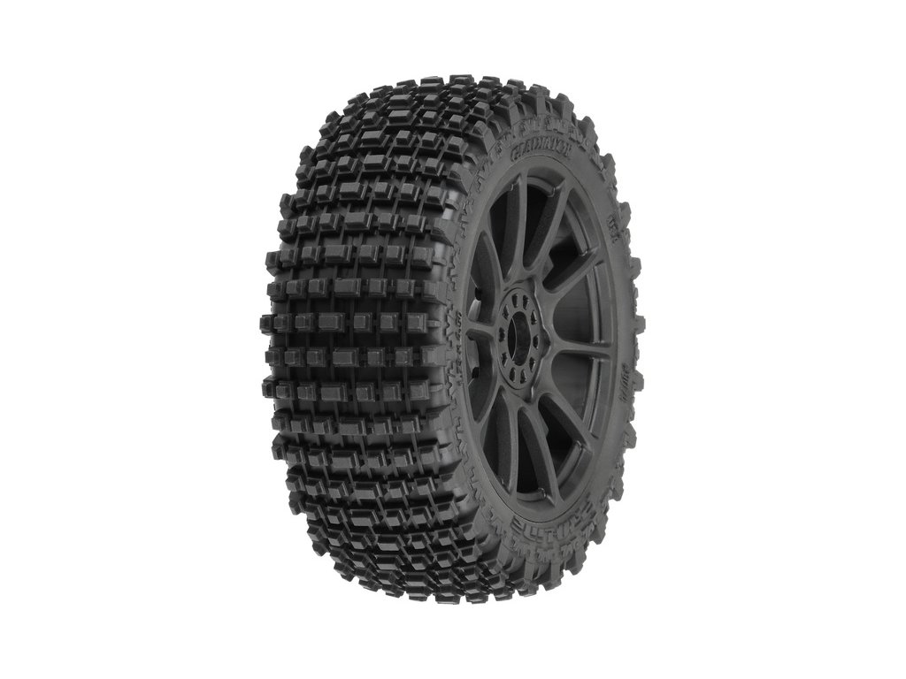 Kompletní kola Pro-Line pro RC modely aut 1:8. Rozměr ⌀114x44 mm. Disk Mach 10 má černou barvu. Pneumatiky Gladiator 3.3", tvrdost směsi M2 (střední). Vložka Closed Cell. Unašeč je šestihran 17 mm.