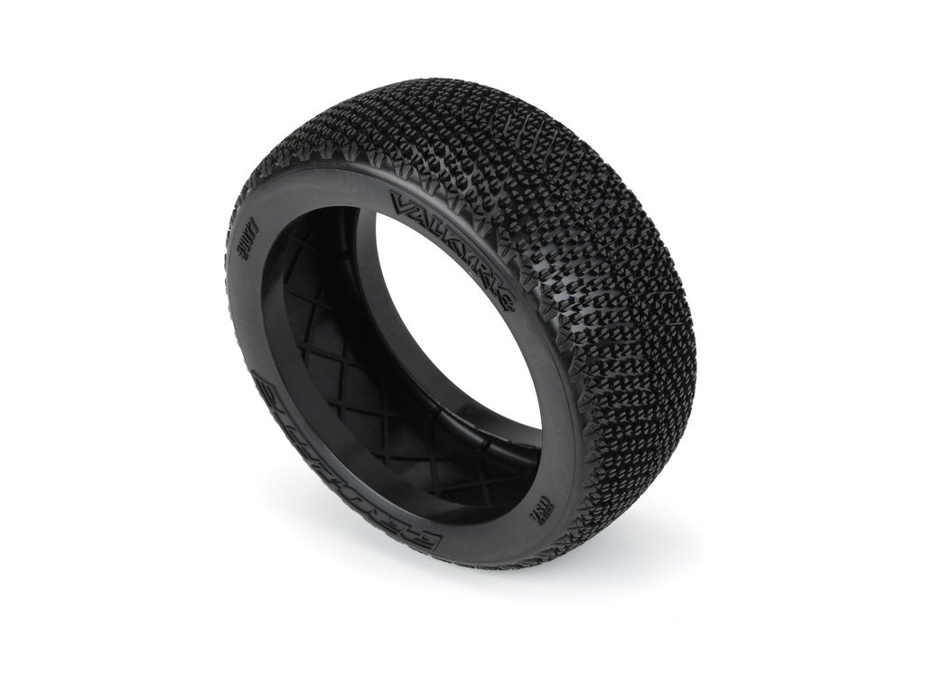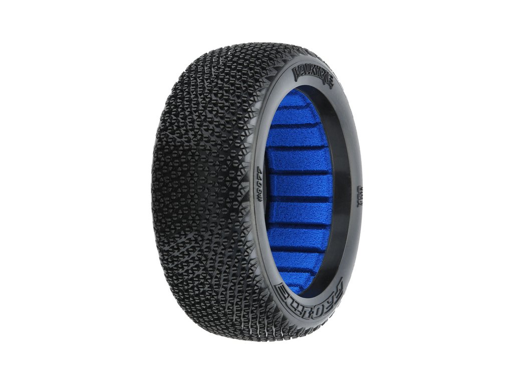 Inovativní vzorek běhounu se vyznačuje strategicky umístěnými diagonálními řadami výstupků, které se setkávají a vytvářejí optimalizovaný středový kryt. Toto uspořádání výrazně odlehčilo pneumatiku při zachování skvělé stability a akcelerace, charakteristik opotřebení při jízdě po nerovnostech. Směrový běhoun na okraji bočnice vám umožňuje vyladit Valkyrie podle vašich konkrétních podmínek na trati pro větší všestrannost. Valkyrie je konstruována na profilu kostry nejnovější generace Pro-Line, který využívá jeden oblouk k vytvoření geometrie bočnice, poté přechází z bočnice do koruny s větším poloměrem, což má za následek kulatější a méně ostrý tvar. Tato kostra se přizpůsobuje disku a vložce, takže montáž je hračka.